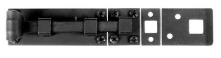 This forged iron square bolt has a 6 x1 3/4" backplate with a 6 7/8" overall length. Bolt comes with three strikes: surface, rim and mortise.